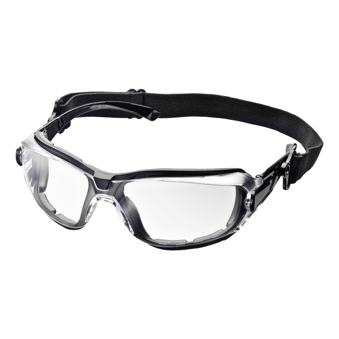 Particularly high and wide spectacle for an integrated brow guard, nose piece and inner edge of soft EVA, flexible side arms, anti-fog and anti-scratch treatment, integrated adjustable and detachable elastic strap.