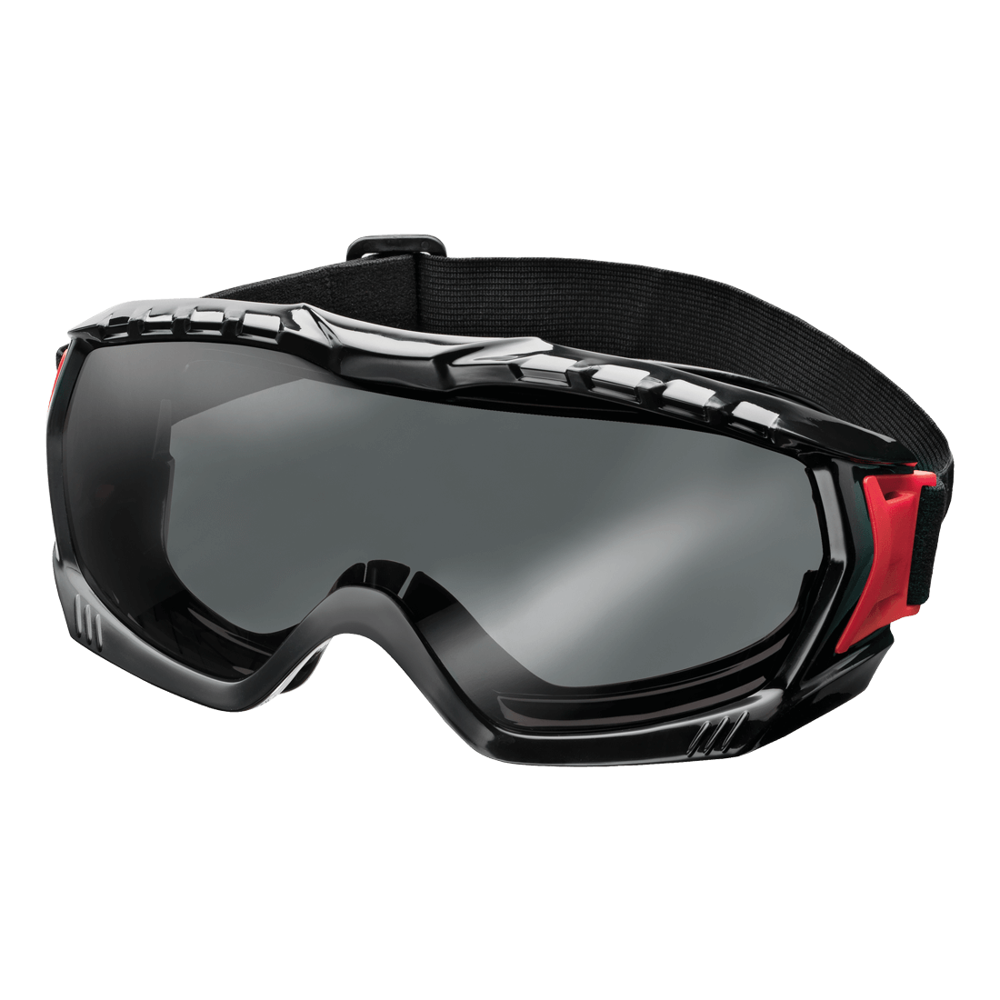 Goggles with dark frame and lens, featuring anti-fog treatment and ventilation holes. Maximum dimension dark lens for 180° vision. Thanks to the internal side slits it can also be used by operators with glasses. Dark version. Lens 2 C-1,2 1 BT
